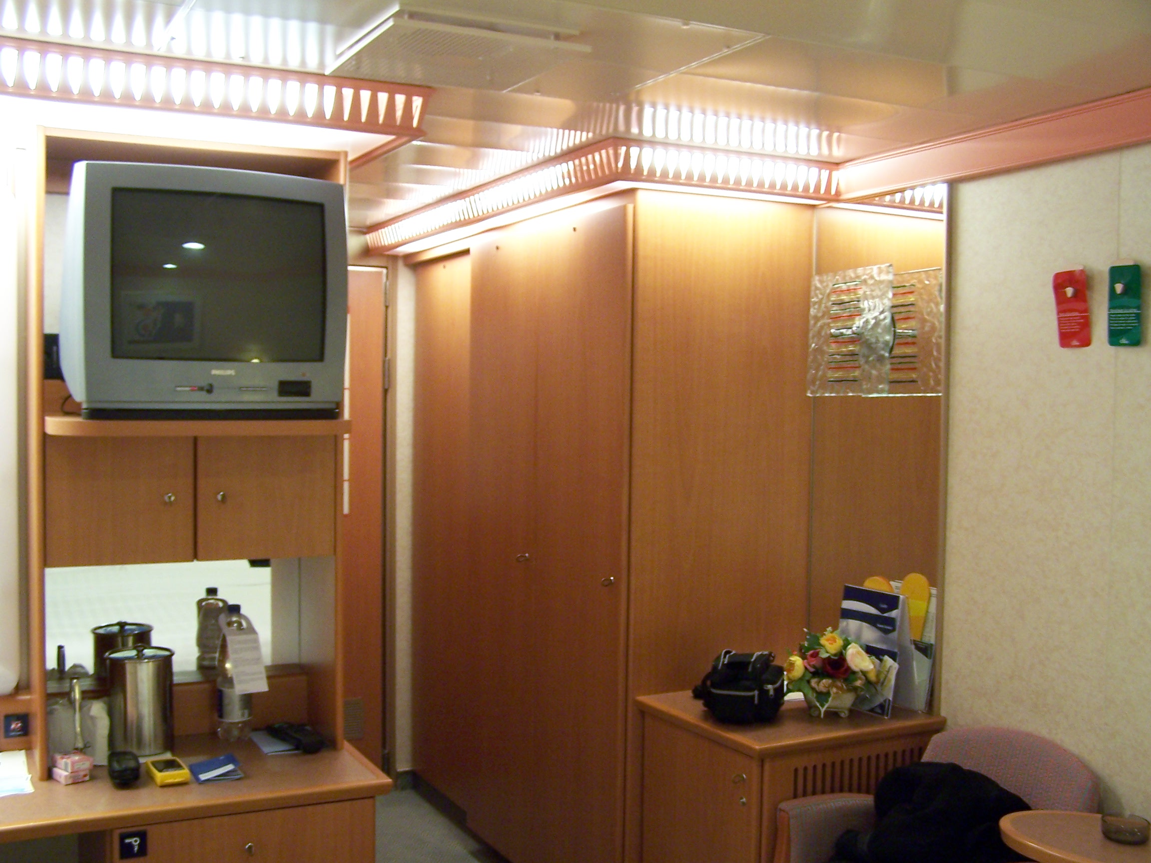 Die Flasche Wasser (rechts neben dem Blechtopf) ist zwar mit dem netten Hinweis beschriftet, das es eine Erfrischung zum Willkommen ist, wird aber später auf dem Bordkonto abgerechnet, auch wenn man sie nicht getrunken hat.