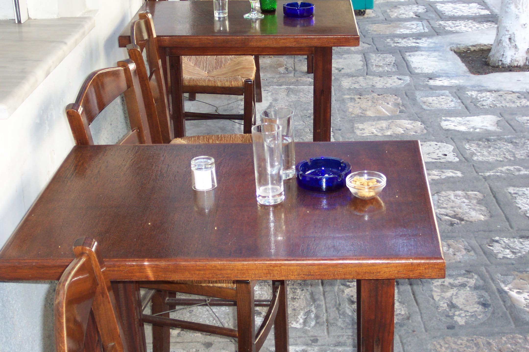Ein (fast) leerer Tisch? Was sagt so ein Tisch dem erfahrenen Griechenlandbesucher? :-) In Griechenland bekommt man, wenn man etwas alkoholisches bestellt, immer etwas zu Knabbern dazu, hier Erdnüsse. Auch bei einem Bier werden kleine Knabbereien unaufgefordert dazugestellt.